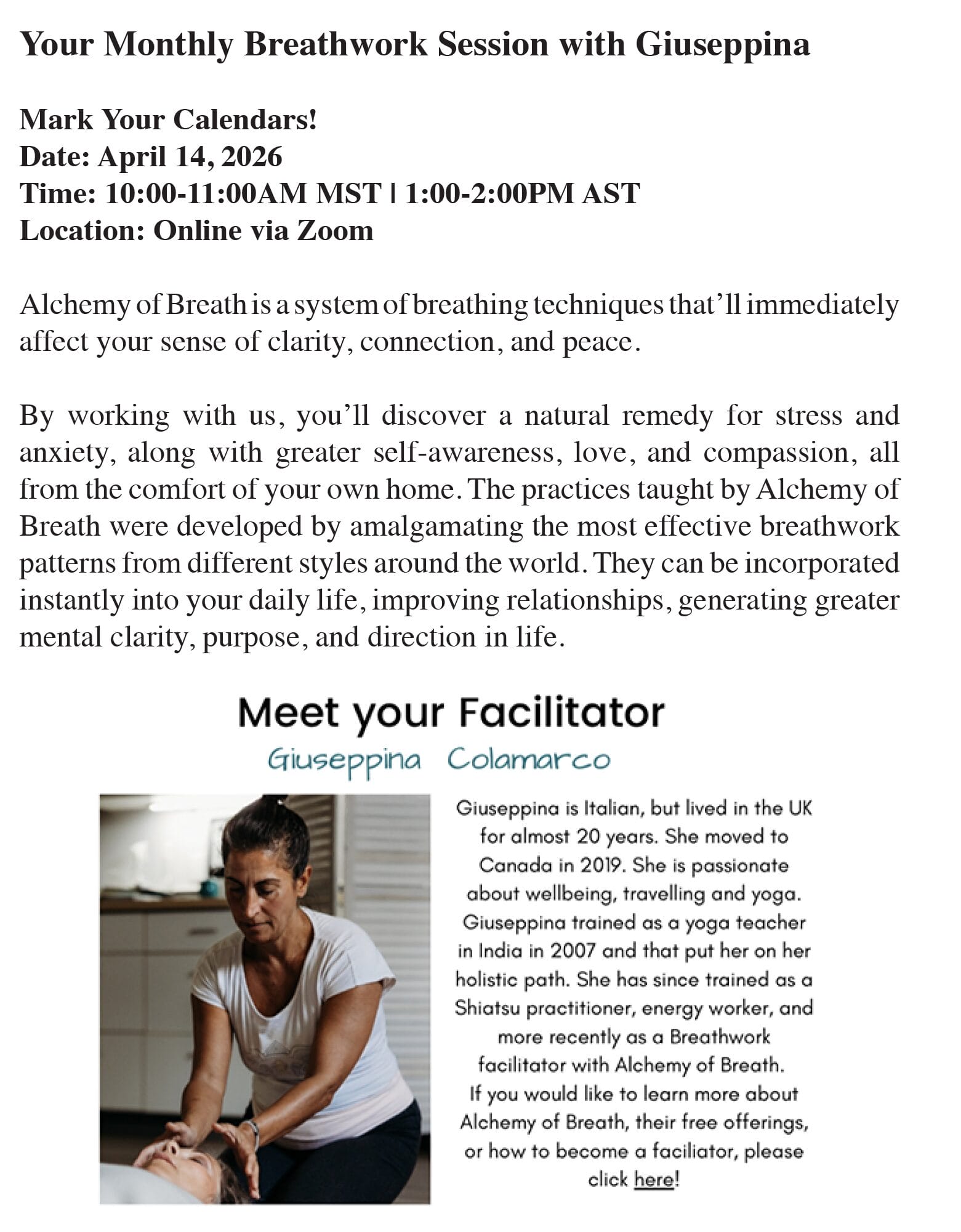 Monthly Breathwork Session with Guiseppina Posted April 13th, 2026 by Donna Modica & filed under . View Calendar April 14, 2026 12:00 - 13:00 https://us02web.zoom.us/j/87830168694#success Twitter Facebook